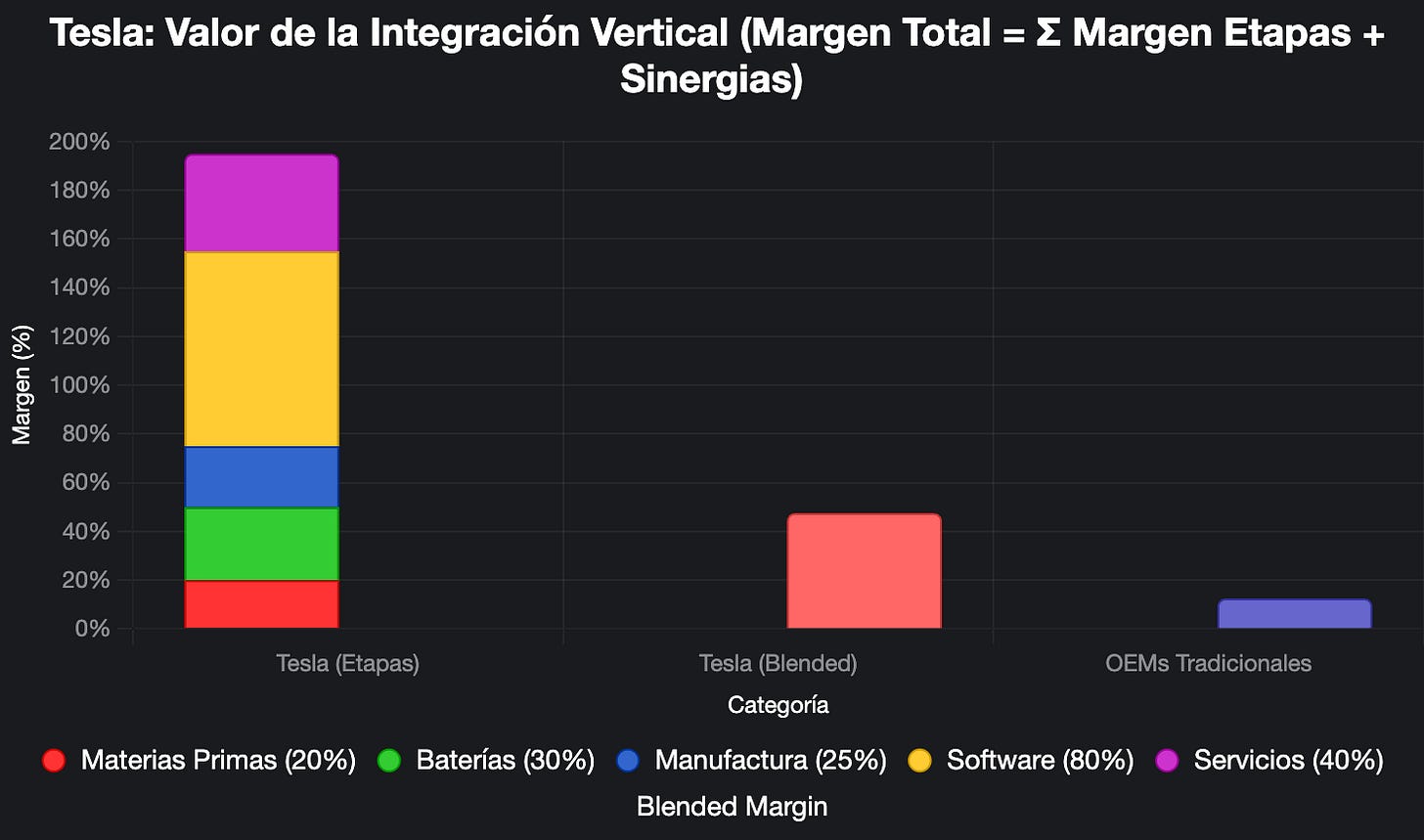 Tesla no está solo haciendo autos o robots. Están integrando verticalmente toda la cadena de valor - desde la extracción de litio hasta el software de IA. Cada integración mejora los márgenes y acelera la innovación. El valor de la integración vertical puede modelarse como:
