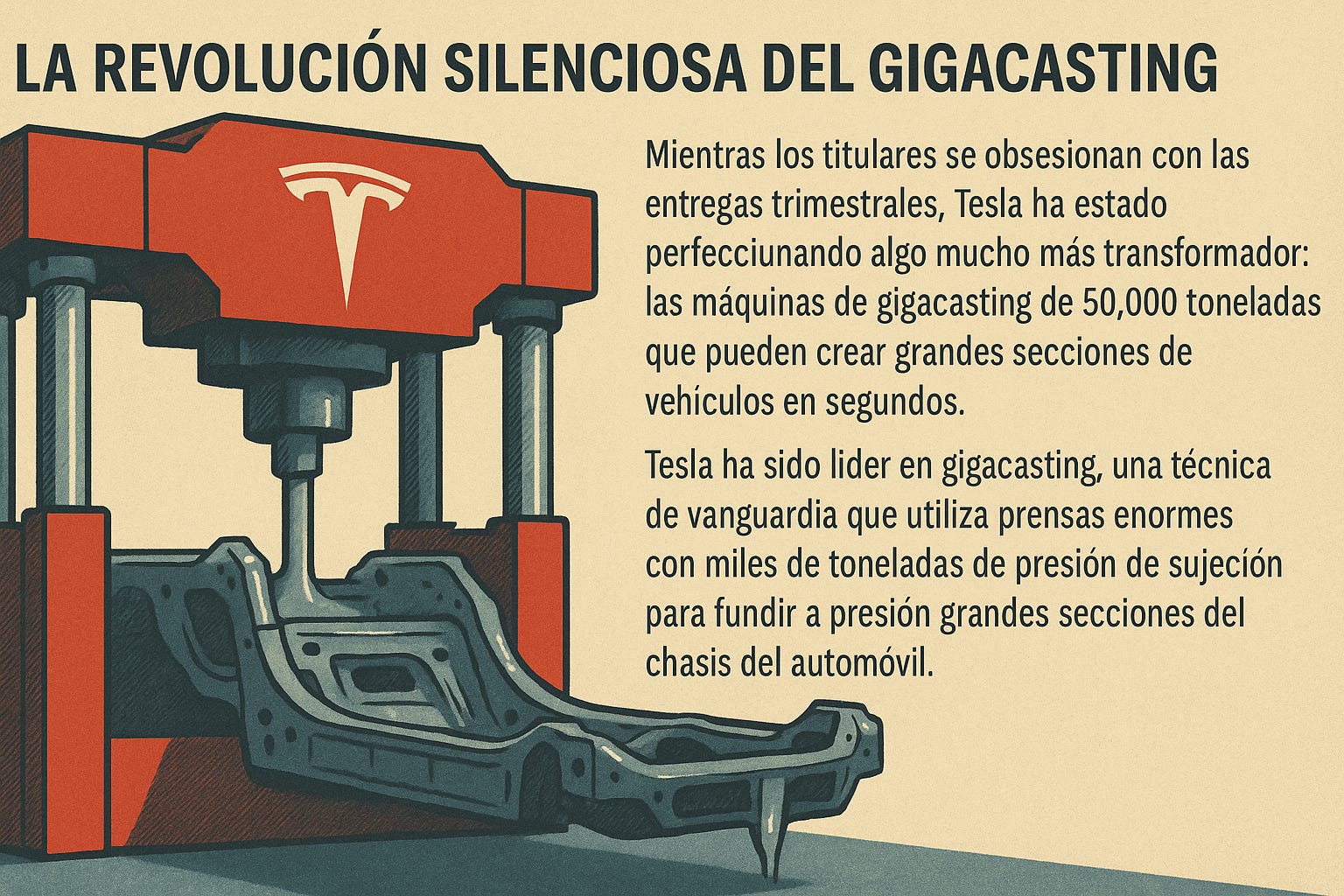 Mientras los titulares se obsesionan con las entregas trimestrales, Tesla ha estado perfeccionando algo mucho más transformador: las máquinas de gigacasting de 50,000 toneladas que pueden crear grandes secciones de vehículos en segundos. Tesla ha sido líder en gigacasting, una técnica de vanguardia que utiliza prensas enormes con miles de toneladas de presión de sujeción para fundir a presión grandes secciones del chasis del automóvil.