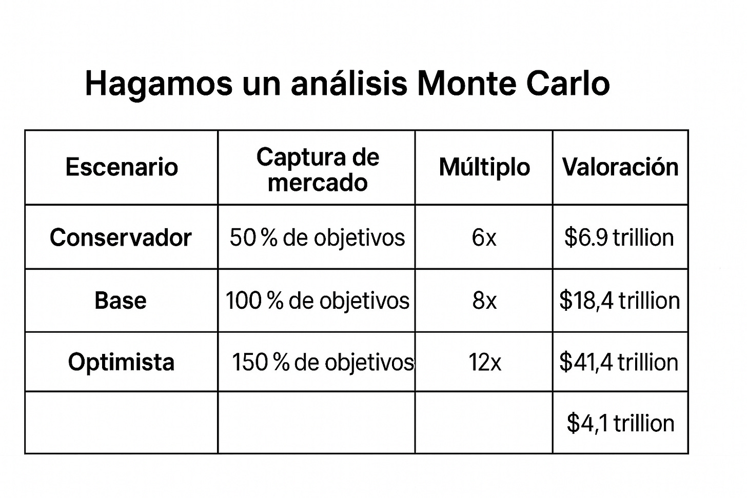 A un múltiplo tecnológico de 8-10x ingresos (conservador para una empresa de alto crecimiento con márgenes de software), eso es una valoración de $18-23 trillion.