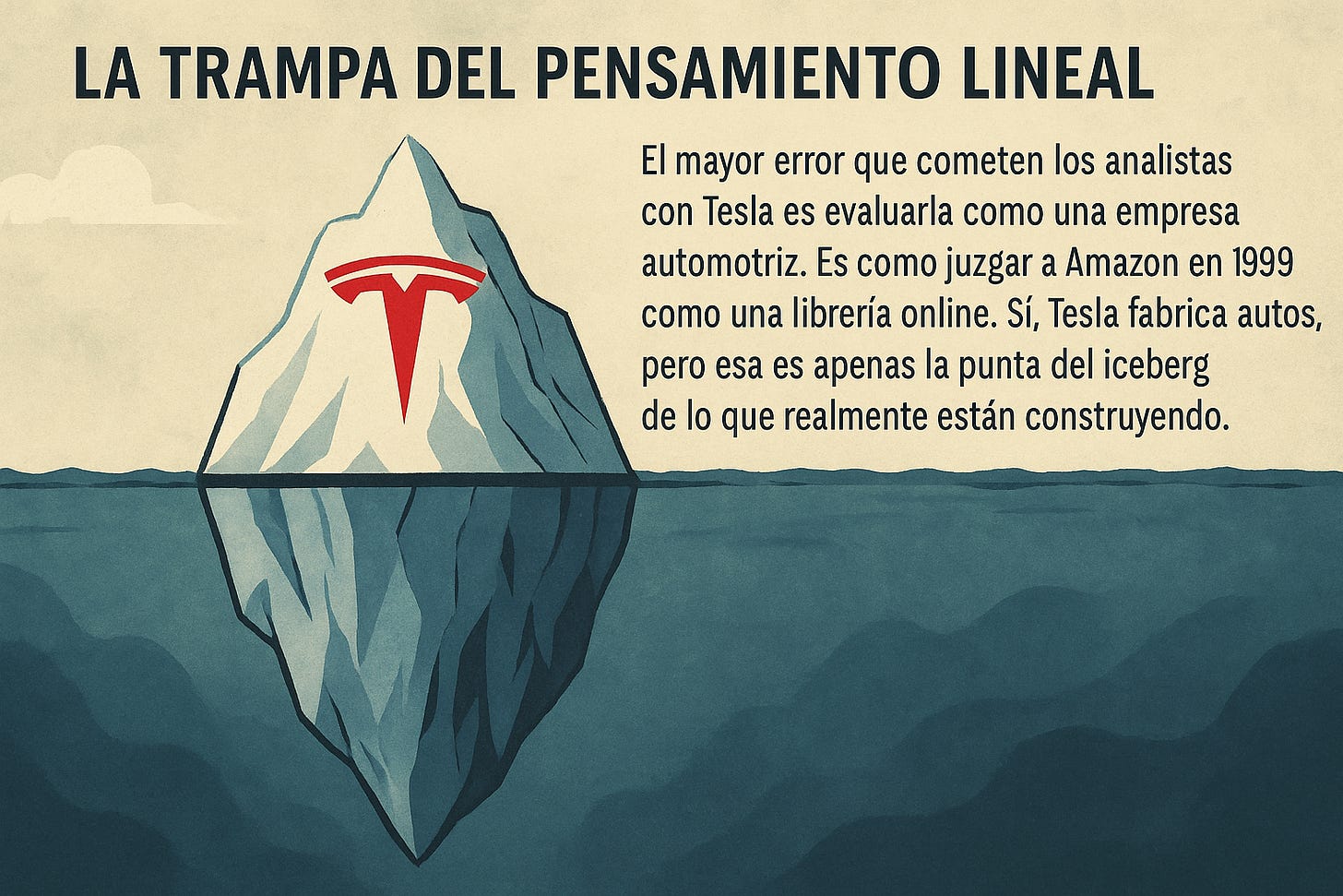 El mayor error que cometen los analistas con Tesla es evaluarla como una empresa automotriz. Es como juzgar a Amazon en 1999 como una librería online. Sí, Tesla fabrica autos, pero esa es apenas la punta del iceberg de lo que realmente están construyendo.