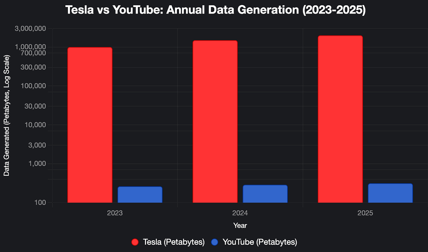 Incluso con más sensores por vehículo, Waymo tiene menos del 0.1% de los datos de Tesla. Y en machine learning, más datos beats algoritmos mejores casi siempre. Y yo que pensaba que la fuente de mayor conocimiento del mundo era Youtube